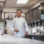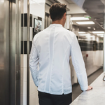 Men's jacket featuring a breathable fabric blend and mesh panels. The statement asymmetric front with hidden fastenings gives a functional design a modern and subtle twist. The sportswear-style elasticated centre back provides a comfortable and flexible fit, which is exactly what busy chefs need as they move around the kitchen.